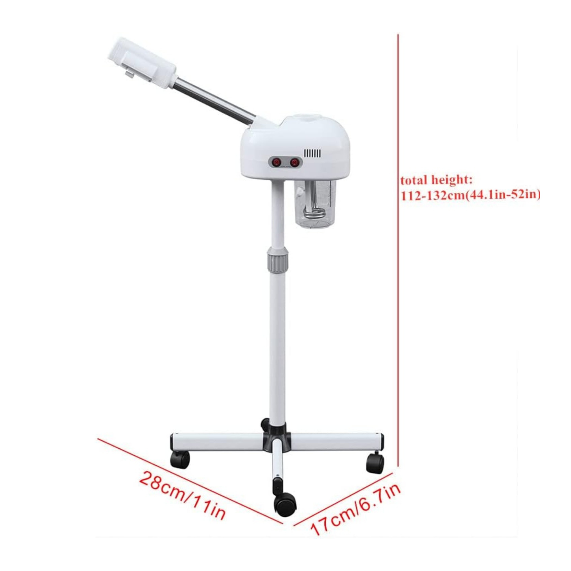 This facial steamer features a 360° rotating nozzle, nano ion technology for deep hydration, and dual-button control. It includes a large-capacity kettle with a rubber stopper for extended steam time and spill prevention. Equipped with universal wheels for easy mobility and compact design to save space. Offers both ozone and steam functions to boost circulation and rejuvenate all skin types. Use tap water only—avoid adding essential oils or medicine directly into the container.