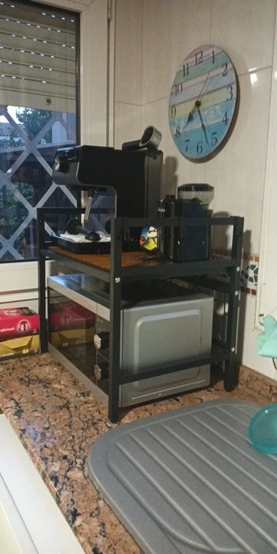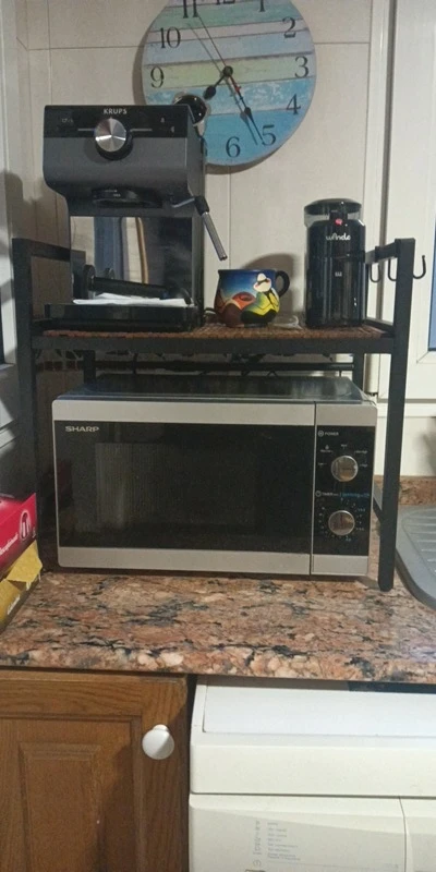 Adjust the shelf to your desired width between 42–64 cm. Place it securely on a flat, stable surface. Position your microwave or kitchen essentials on top and ensure weight is evenly distributed.